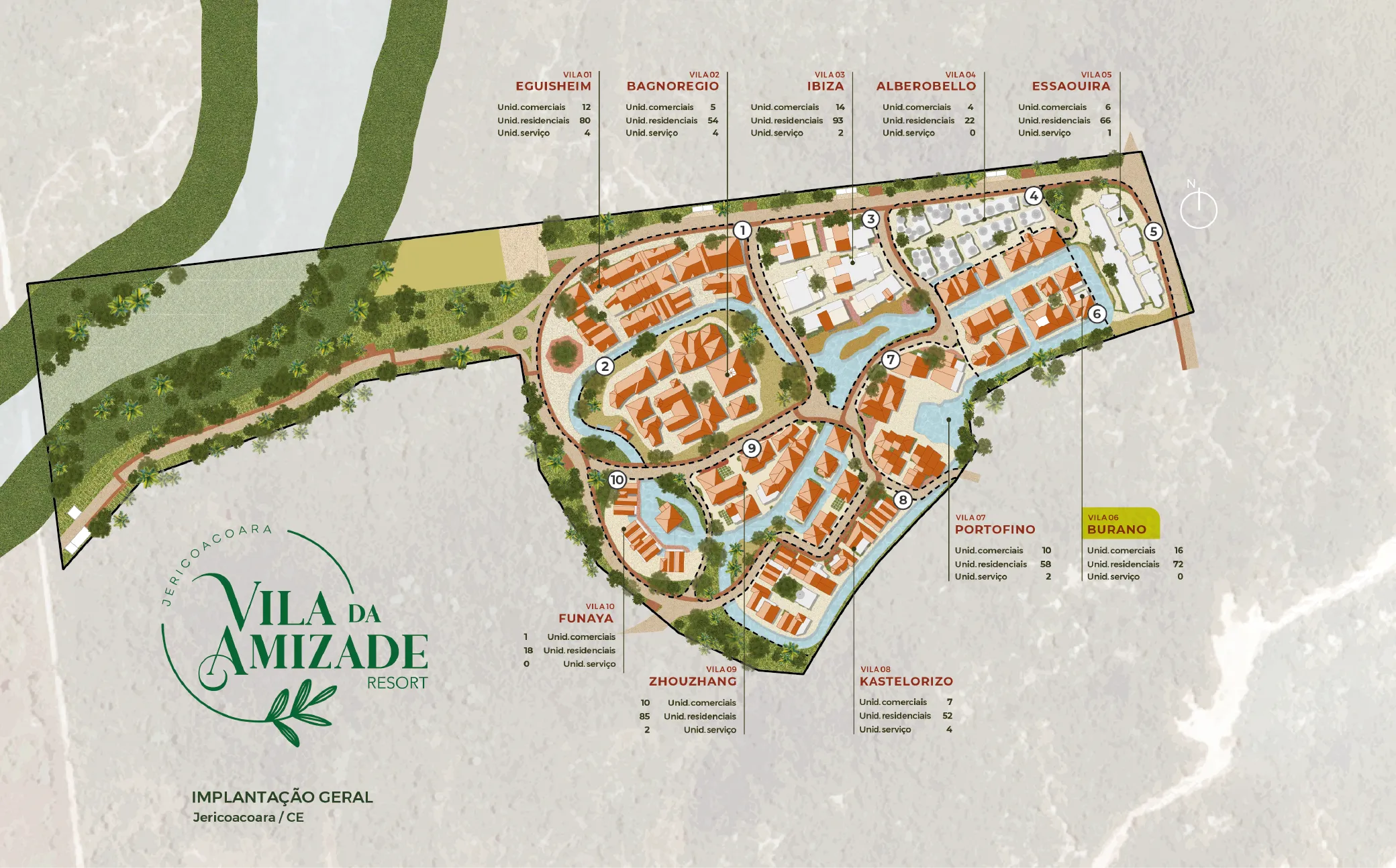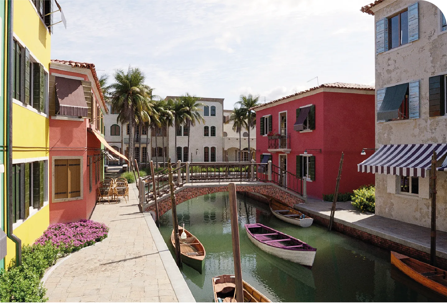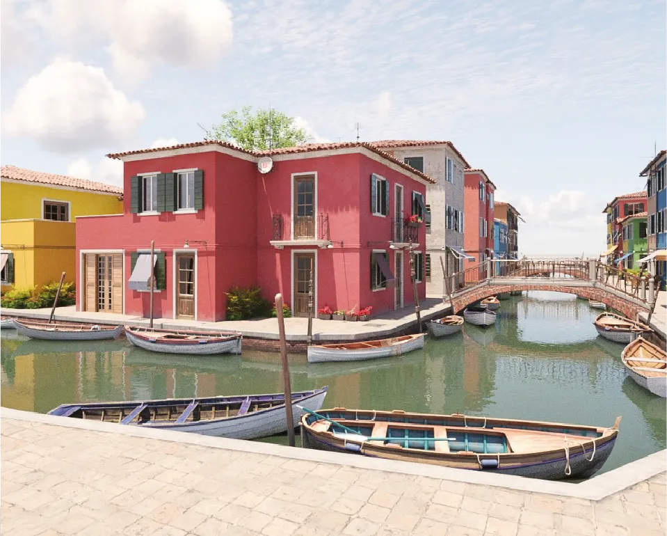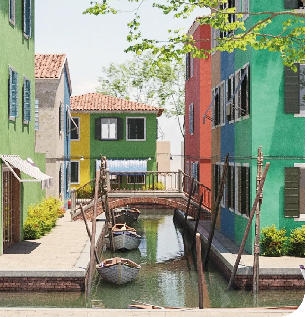 A vila Burano terá 72 apartamentos. Aqui você irá desfrutar de ruas alegres e se envolver pelo espírito artístico dessa vila à beira da Lagoa do Paraíso.